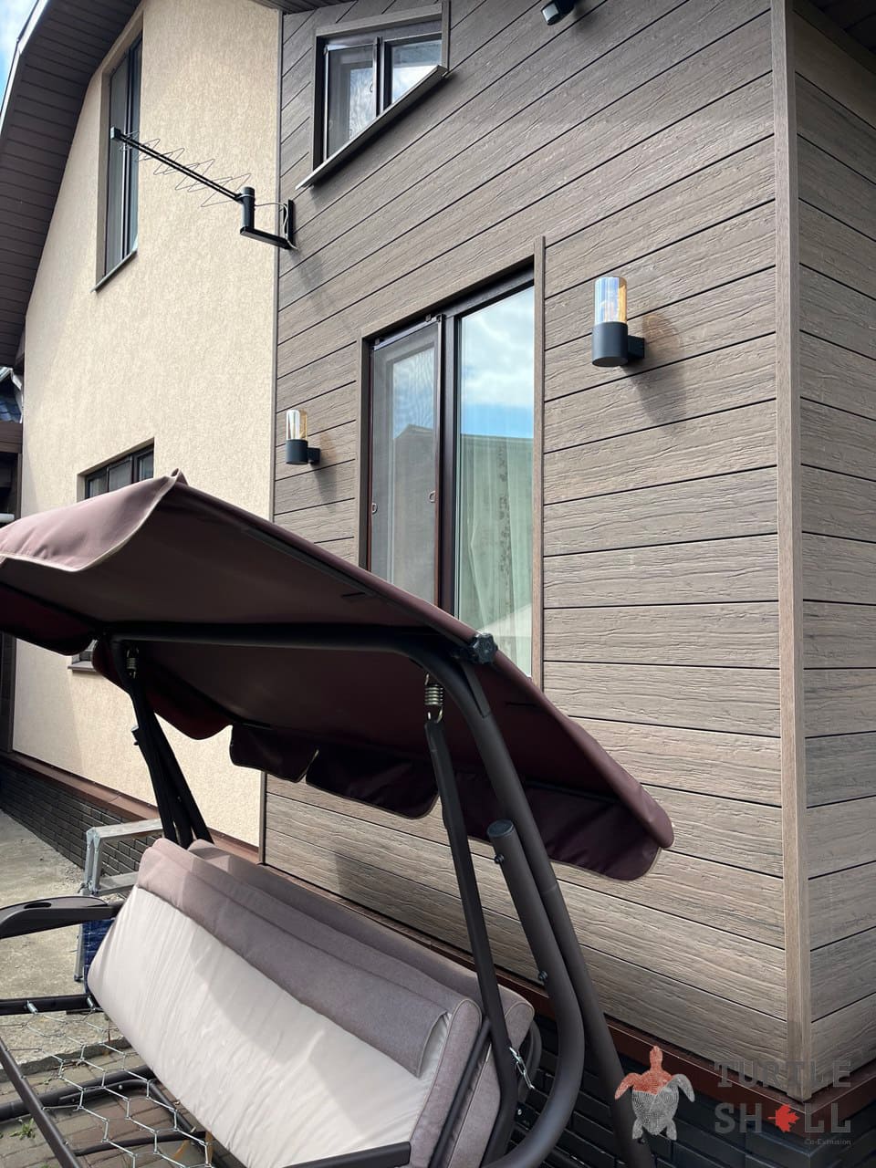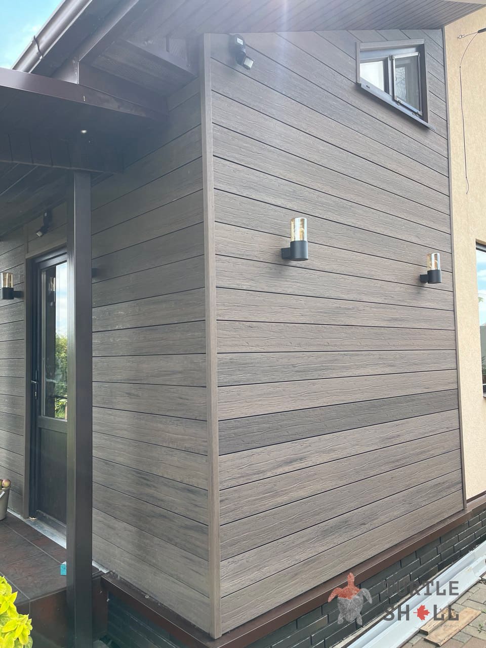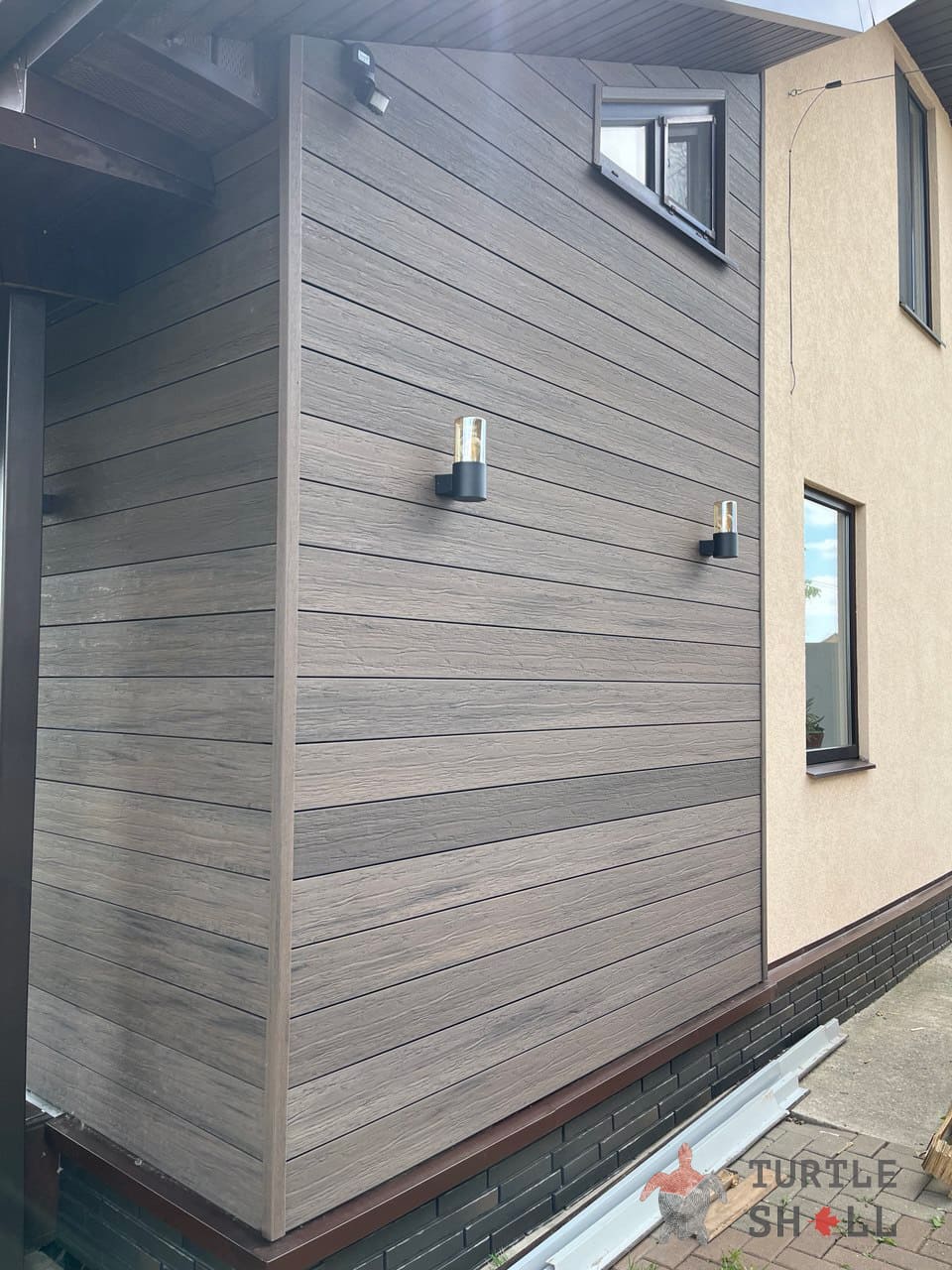 Реечные панели из ДПК Turtle Shell - 55% древесных волокон, (твердые лиственные породы дуб, ясень, клен, тополь ) 35% ПЭВП, 10% добавок, включая краситель. Толщина коэкструзии составляет 0,6 мм.